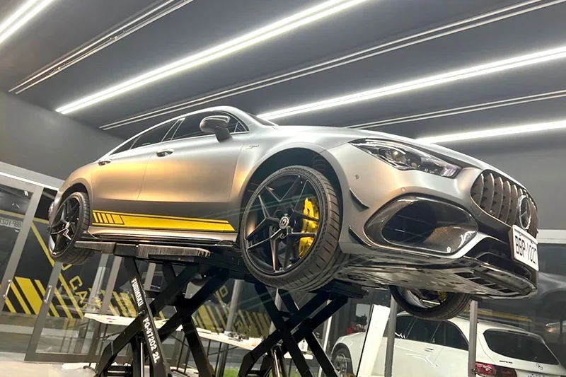 頂高機雖然是外面常見的設備,但在汽車美容會看到就真的少見,好奇的詢問老闆為何需要頂高機,老闆回覆說因為汽車底下很多時候在施作是看不清楚的,不管是汽車美容還是汽車包膜,視野都不是很好,有頂高機可以施作的範圍及細緻度會更高,所以有了頂高機能夠提升美容/鍍膜/包膜的完整度,雖然車底靠近地面客戶能看到的並不多,但在 鍍卡DO CAR絕不能因此而馬虎。